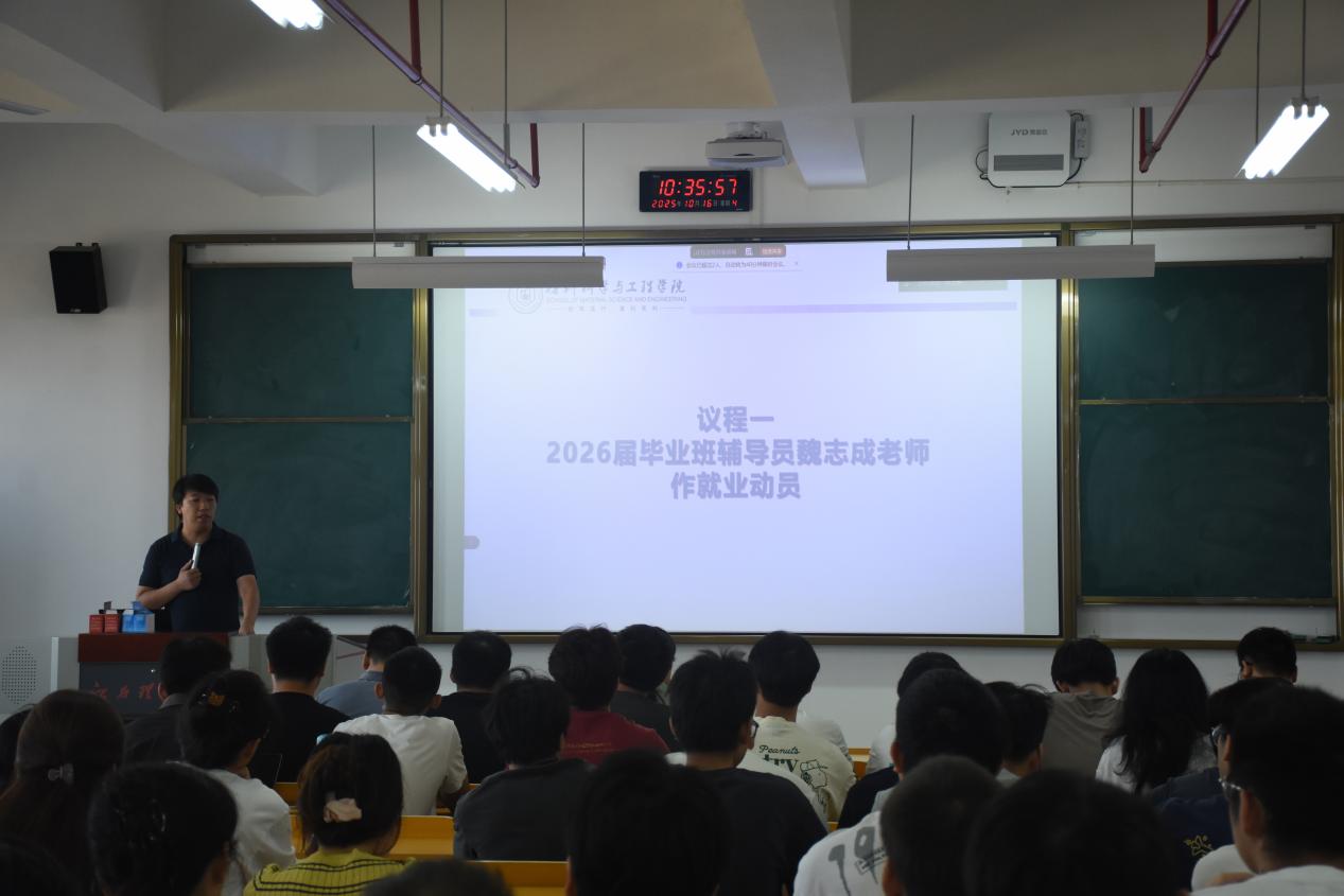 本网讯 为引导毕业生了解当前就业形势,树立正确的就业观念,有序推进2026届毕业生高质量就业工作,近日,材料科学与工程学院在三江校区西园阳明楼举行2026届毕业生就业动员大会,本次会议同时设立线下主会场和线上分会场。学院党委副书记丁能文、就业辅导员黄松炜、毕业班辅导员魏志成及全体2026届毕业生(含联合培养毕业生)参加会议,本次动员会邀请到学校招就处就业科郭传州和党委武装部、保卫处朱元峰2位老师,会议由黄松炜主持。
