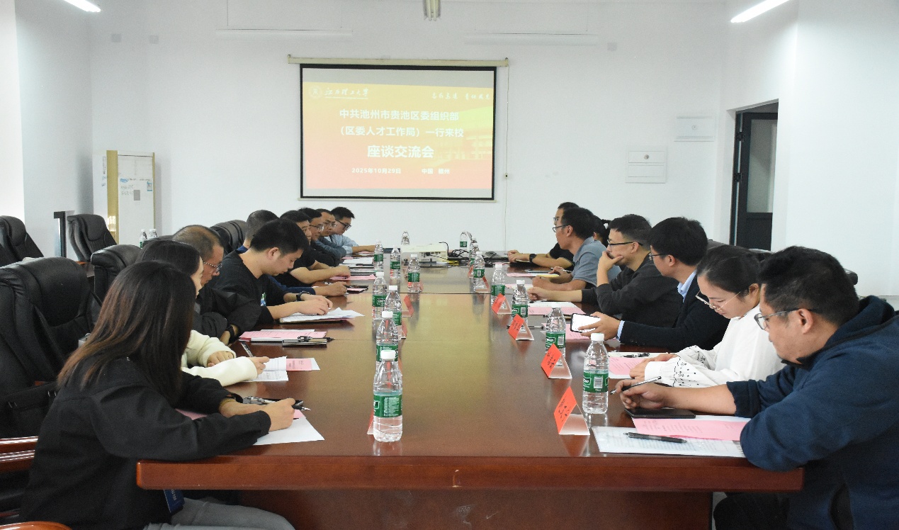 本网讯 10月29日,中共池州市贵池区委组织部(区委人才工作局)一行莅临江西理工大学材料科学与工程学院,开展校地人才对接座谈会。贵池区人社局党组成员、副局长吴新,贵池区公共就业和人才服务中心副主任包文虎等单位代表,材料科学与工程学院党委副书记丁能文、院长助理李栋及相关教师等校方代表参加座谈,会议由学院党委副书记丁能文主持。